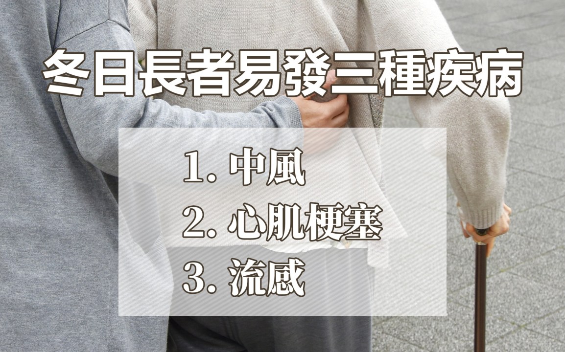 冬季長者易發之三種疾病:(1)中風、(2)心肌梗塞、(3)流行性感冒