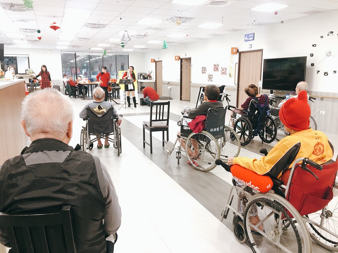 2018年的尾聲,感謝多納藝術樂團及小豆芽室內樂團的老師及小朋友們犧牲連假假期、特地到長宸護家來進行演出。喜氣洋洋的裝扮也為即將到來的新年度增添色彩,讓幸福透過悠揚樂聲傳遞到阿公阿嬤的心中。